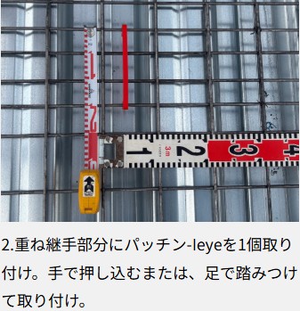 「パッチン-leye」は、取り付けるだけで誰でも簡単に規定の重ね継手を確実に確保できる新発想のスペーサーです。